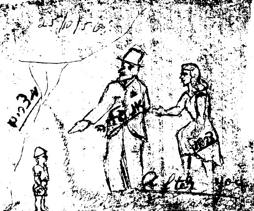 Caricature by Israeli Minister of Defense Drayan: England (father) and France (mother) telling Israel (child) to go to the Suez Canal, JSTOR.