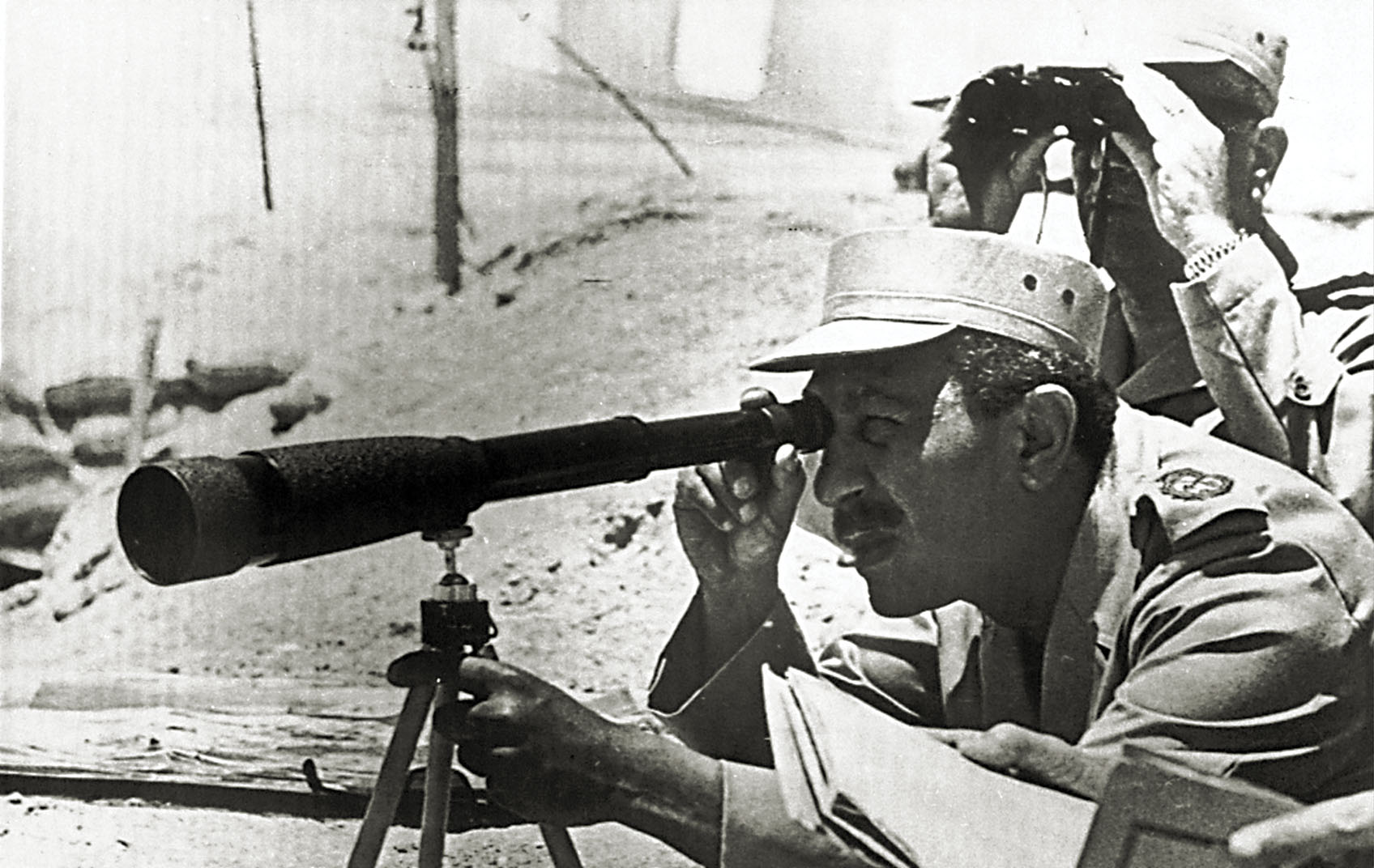 Egyptian President Anwar Sadat observing Israeli Forces on the Suez Canal, History Extra.